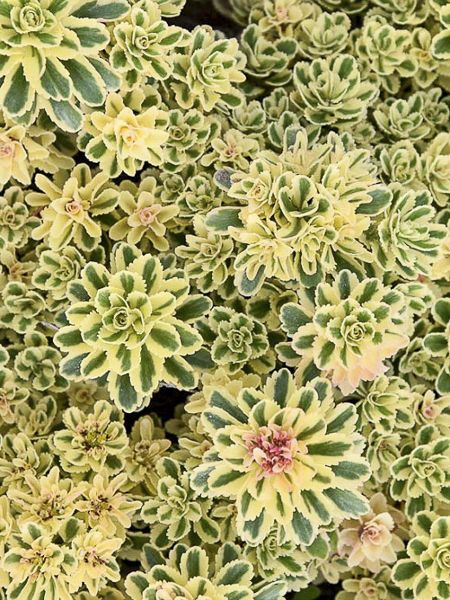 Rosettes de feuilles dentées, gris-vert marginé de crème, certaines sont entièrement crème rosé à rouge cerise. Boutons floraux rose.
