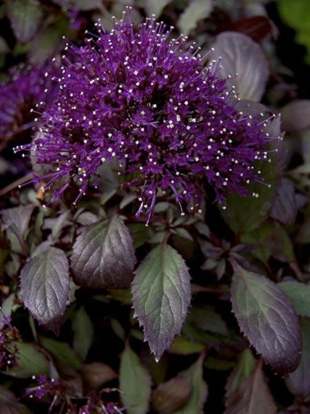 Feuilles lancéolées vert et pourpre très sombre. Petites fleurs tubulaires violet sombre.
