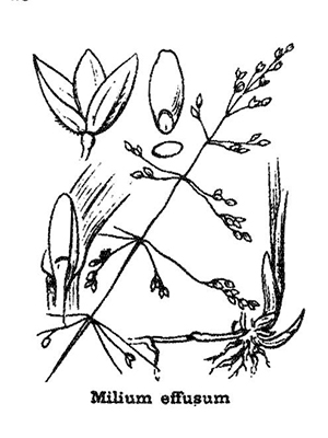— Plante vivace de 50 cm à 1 mètre et plus, glabre, à souche émettant de courts stolons ; tige dressée, lisse ainsi que les gaines ; feuilles assez longues, larges de 6-12 mm rudes aux bords ; ligulé oblongue ; panicule longue de 15-25 cm, ample, pyramidale, lâche, verte ou parfois violacée, à rameaux étalés, à la fin réfléchis, peu rudes ; épillets écartés, ovoïdes, longs de 3-4 mm ; glumes ovales-aiguës, trinervées, presque lisses ; glumelle inférieure subaiguë ; caryopse noirâtre, convexe sur les deux faces. Bois et lieux ombragés, dans presque toute la France ; nul dans la région méditerranéenne ; Corse. — Europe ; Asie tempérée ; Amérique boréale. = Mai-août.