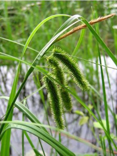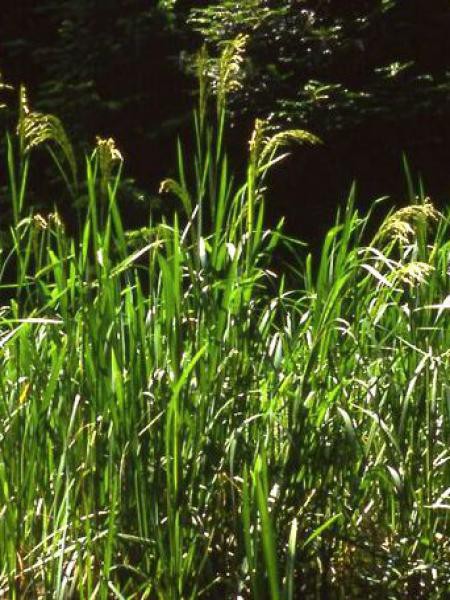 Graminée à feuillage bleutée et épillets blanc-vert.