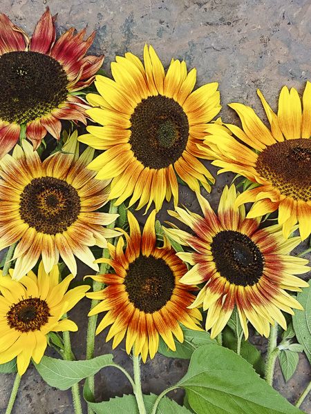 Fleurs de 20-25 cm de diamètre) aux chaudes couleurs variant du jaune au pourpre.