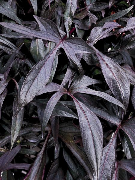 Cette variété de patate douce est cultivée pour ses feuilles palmées pourpre très sombre. Pour potée ou suspension.