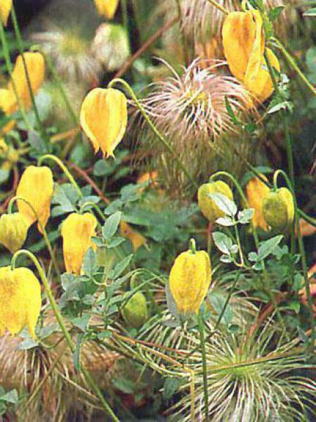 Vigoureuse clématite donnant des fleurs jaunes, simples, campanulées, puis des têtes fructifères duveteuses argentées.