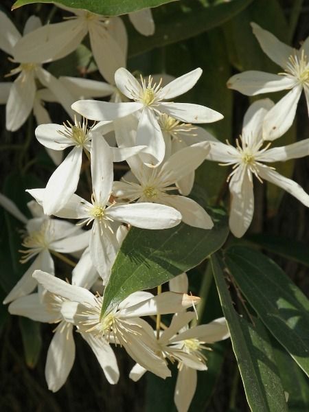 Clématite à feuillage persistant et lustré. Fleurs blanches, étalées, parfumées, à anthères crème, groupées en bouquets.