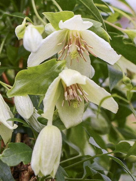 Variété de clématite au feuillage persistant, d'aspect cireux. Petites fleurs en cloche, blanc cireux, à anthères pourpre. Elle fleurira en hiver si les températures ne sont pas trop froides. Rusticité de l'ordre de -10°C.