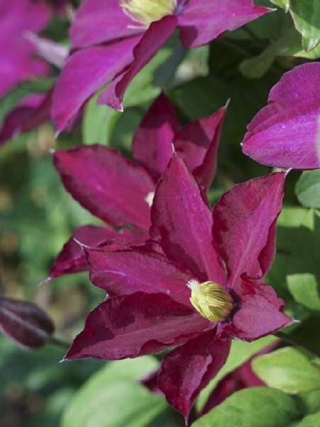 Ancienne variété de clématite aux grandes fleurs estivales rouge magenta, maculé de blanc au revers des tépales. Anthères crème.