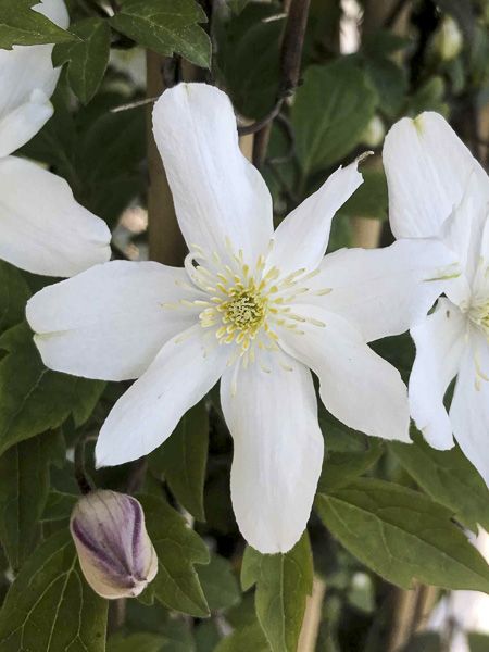 Clématite des montagnes aux fleurs semi-doubles, blanches, à anthères jaune beurre. Parfum discret de vanille. Floraison printanière, remontante en début d'automne.