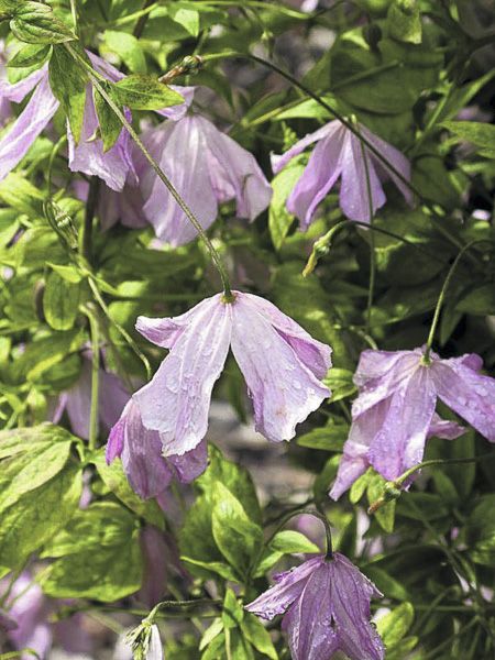 Clématite à floraison semi-tardive et abondante. Fleurs simples, pendantes, en clochette ouverte, rose tendre argenté.
