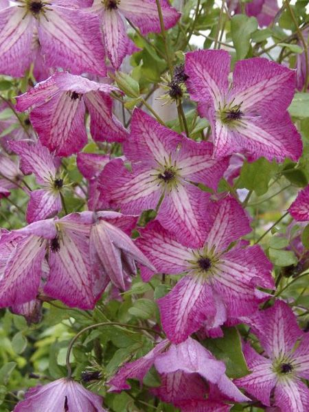 Clématite à floraison tardive et abondante. Fleurs simples, blanches, fortement veiné et marginé de rose vif, à gorge verte.