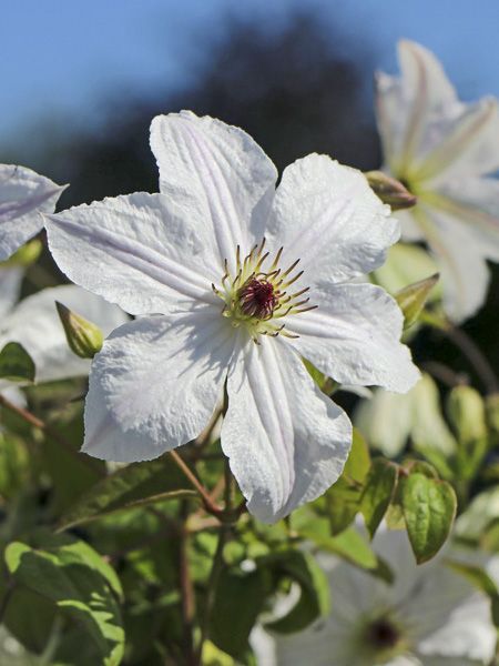 Clématite à floraison tardive et abondante. Grandes fleurs simples, blanc immaculé et anthères à pointes pourpre.