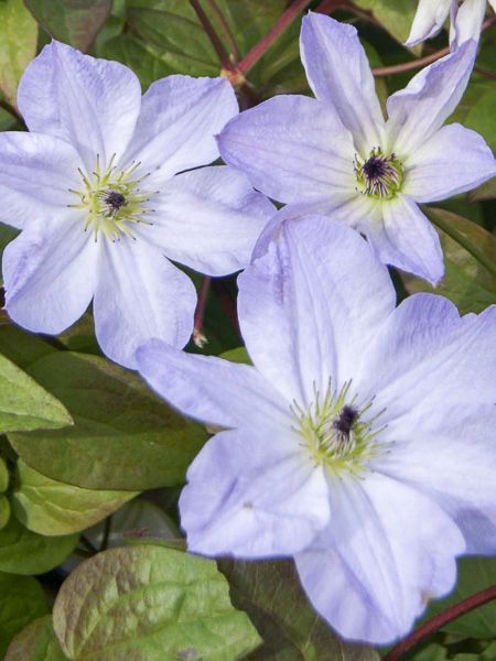 Clématite à l'abondante et très longue floraison. Fleurs en étoile, simples, bleu lavande pâle.