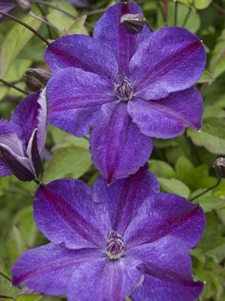 Clématite à floraison tardive et abondante. Fleurs en étoile, simples, violette, à médiane pourpre.