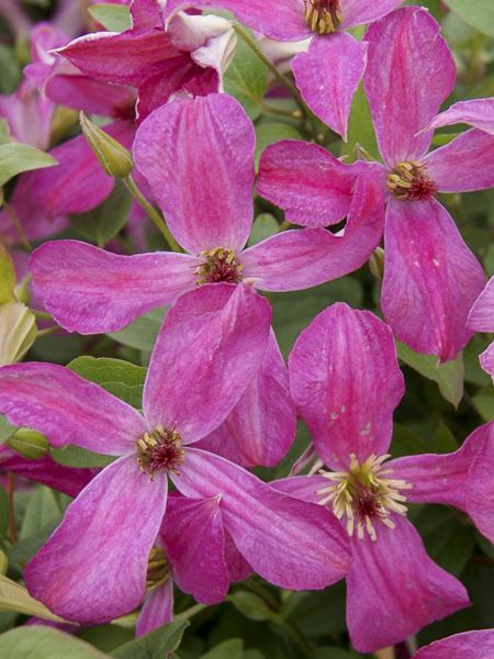 Clématite à floraison tardive et abondante. Petites fleurs en étoile, simples, à tépales ondulés, rose foncé, à anthères crème et rouges.