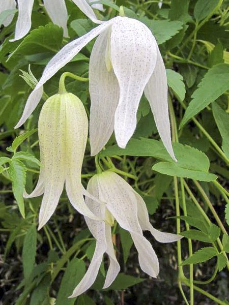 Cette clématite à floraison précoce produit une masse de fleurs en clochette à longs tépales blanc moucheté de lilas.