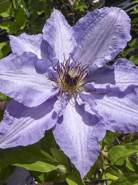Clématite de taille moyenne aux grandes fleurs étoilées, aux tépales ondulés, mauve soyeux et bouquet central d'anthères crème à pointes violettes. Floraison en fin de printemps avec une remontée en fin d'été.