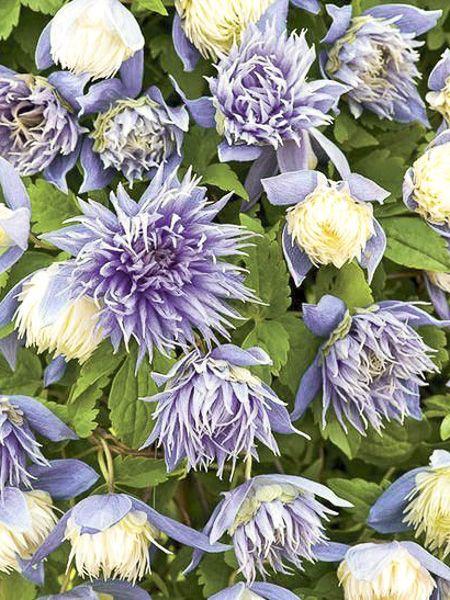 Clématite aux fleurs bleu clair à cœur double crème à bleu lavande. Fruits plumeux à l'automne. Très florifère.