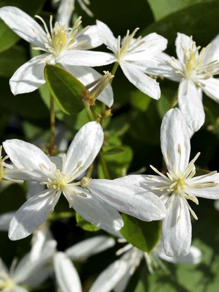 Grimpante vigoureuse à floraison tardive et feuillage semi-persistant ou caduc. De juin à octobre, abondante floraison en cymes paniculées formées de fleurs très parfumées, de 3 cm de diamètre, étoilées, aux sépales blancs, avec des anthères crème.