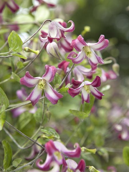 Clématite aux petites fleurs en forme de tulipe, rose vif à l'extérieur, blanches et rose à l'intérieur et anthères jaunes. Culture en pot possible.