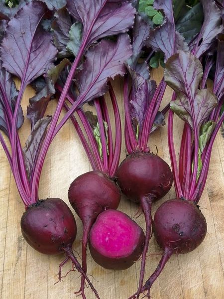 Variété de betterave rouge issue de la très ancienne variété française 'Crapaudine'. Ses feuilles pourpre intense peuvent dégustées en salade. Sa racine, en forme de navet, est rouge sombre et bien savoureuse.