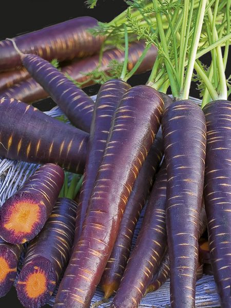 Variété originale pour ses carottes de couleur violette. Racines demi-longues, coniques à chair violette à l'extérieur, orange au cœur, tendre, à saveur sucrée.