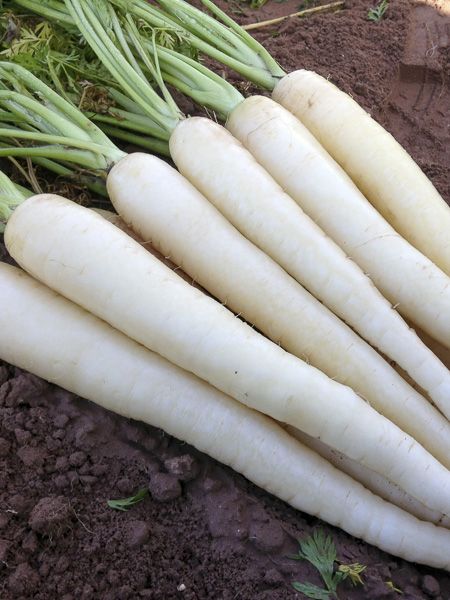 Racine longue (20-25 cm), conique, blanche. Chair bien sucrée. Décoratif en salade.