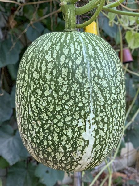 Fruits ovoïdes, jusqu'à 6 kg, vert marbré de taches blanches.
