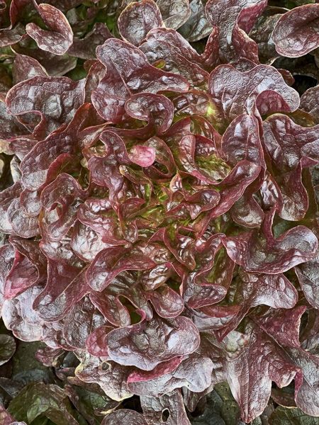 Laitue aux feuilles de chêne rouge pourpré. Cœur bien rempli. Résistante aux maladies et à la montaison.