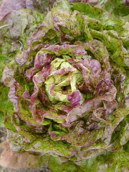 Ancienne variété de laitue aux pommes de 20-25 cm de diamètre. Feuilles vert tendre moucheté de rouge sang, plus prononcé vers le cœur. Tendre et savoureuse.