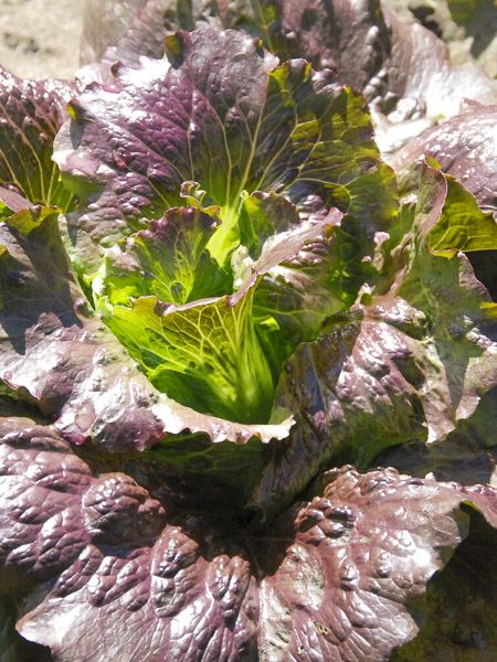 Batavia d'automne et d'hiver. Feuilles croquantes et savoureuses, vert tendre ponctuées de taches rouge sang. Tardive, résistante aux maladies.
