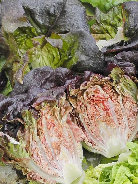 Batavia d'automne et d'hiver. Feuilles croquantes et savoureuses, vert tendre ponctuées de taches rouge sang. Tardive, résistante aux maladies.