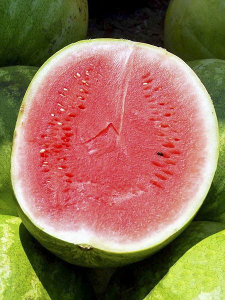 Précoce. Fruits ovales de 10-12 kg, vert clair marbré de vert sombre, à chair rouge vif, très sucrée et bien juteuse. Bien résistante aux maladies.