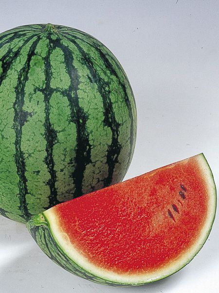 Précoce. Fruits ovales de 10-12 kg, vert clair marbré de vert sombre, à chair rouge vif, très sucrée et bien juteuse. Bien résistante aux maladies.