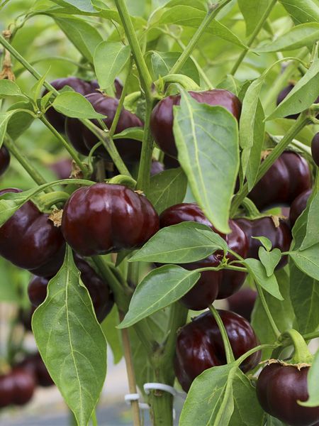 Variété produisant des mini poivrons côtelés, à 2-3 lobes vert, brun chocolat à maturité. Chair épaisse. Bon à farcir. Chaque pied produit jusqu'à 75 fruits.