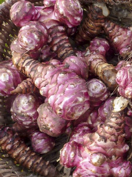 Grand développement. Tubercules de forme irrégulière, à la peau et chair rose.