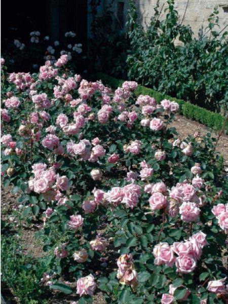 Grosses fleurs au puissant parfum de rose de mai, crème à coeur rose. Excellente résistance aux maladies.