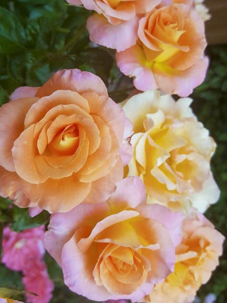 Rosier à fleurs groupées, aux roses bien formées, dans les tons abricot, pêche, orangé et rose. Feuillage sain. Floraison continue de l'été jusqu'aux gelées.