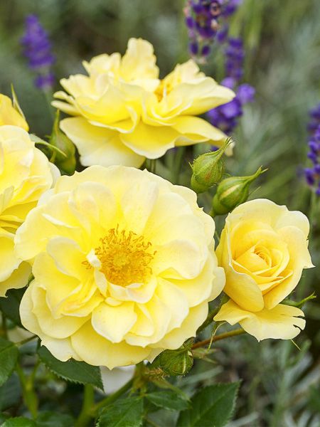 Rosier bas, très touffu.. Bouquets composés de fleurs, semi-doubles, jaune citron, teinté de rose par temps frais, en vagues successives de juin à octobre. Très résistant aux maladies. À utiliser en couvre-sol.