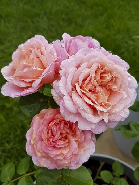Fleurs aplaties, très doubles, rose tendre, au cœur plus foncé, virant à l'abricot. Parfum puissant de rose de Thé, aux notes de citron et pamplemousse. Sain et vigoureux. Rosier Austin.