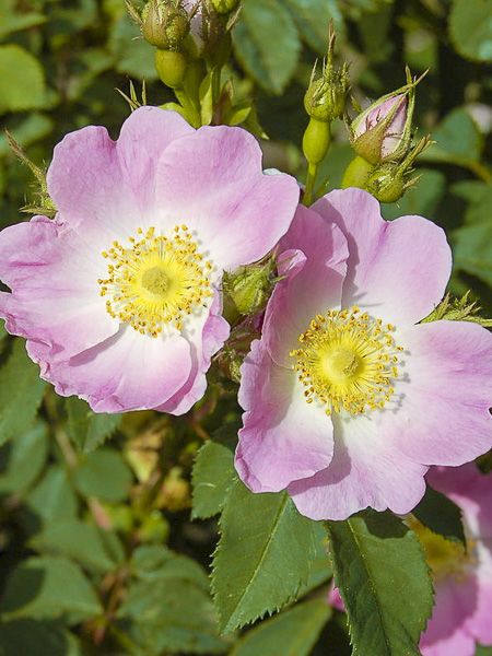 Rosier botanique. Branches légèrement retombantes. Fleurs de 5 cm de diamètre, rose léger, suivies de gros cynorhodons rouges. Floraison en juin-juillet.