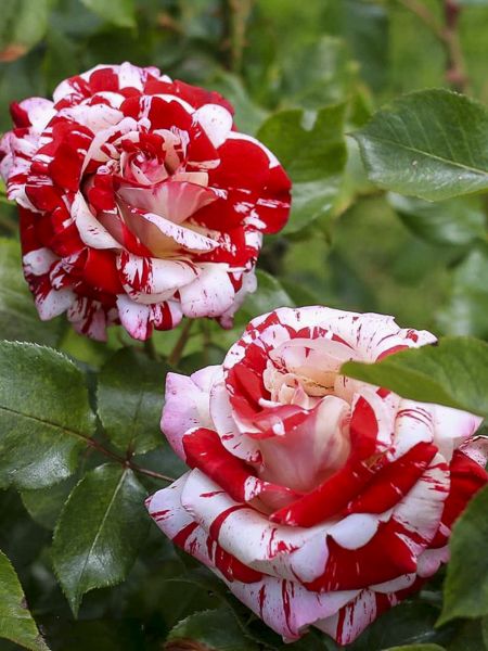 Rosier moderne d'obtention récente aux fleurs turbinées, blanc crème strié aléatoirement de rouge, au parfum agréable. Floraison de juin à octobre. Feuillage très sain.