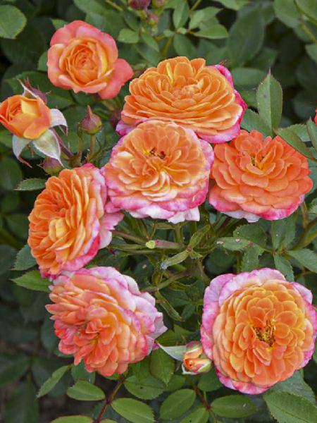 Ce rosier vigoureux et érigé, produit une abondance de fleurs doubles, aux tons chauds, l'orange lumineux prédomine, bordé de rose et de blanc, légèrement parfumé.