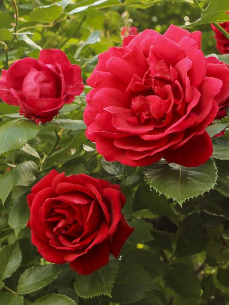 Grandes fleurs, pleines, souvent groupées en bouquets, rouge sang. Léger parfum de rose sauvage.