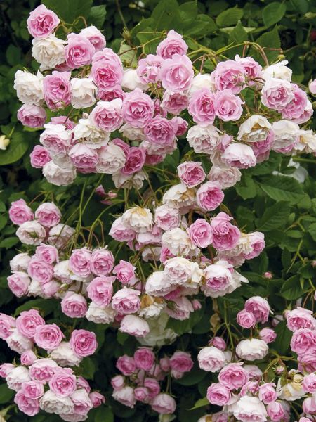 Ancienne variété de rosier hybride moschata grimpant aux bouquets de petites fleurs agréablement parfumées, doubles, rose, se décolorant au crème. Feuillage sain, vert clair.
