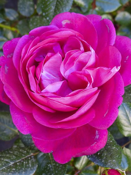 Fleurs à l'allure de rose ancienne, de 8 cm de diamètre, rose-rouge à reflets magenta magenta. Parfum étourdissant.