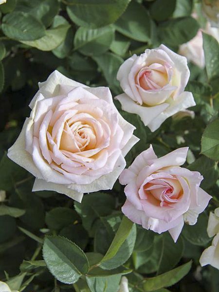Compact, de taille modeste. Fleurs de 11 cm de diamètre, doubles, blanches teintés de rose, au parfum fruité et sucré. Feuillage vert foncé. Excellente résistance aux maladies.