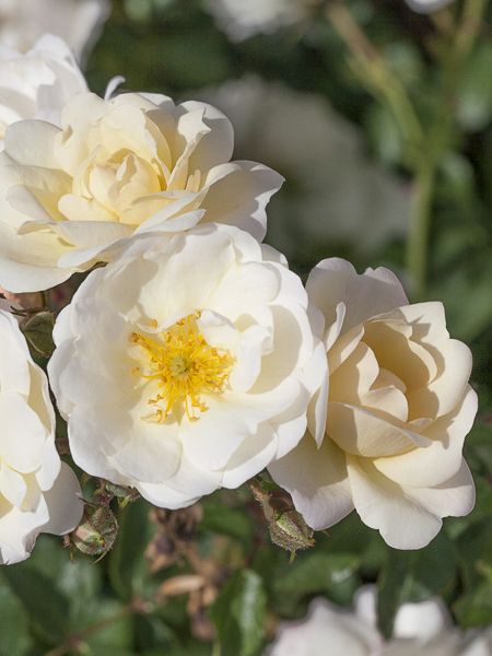 Rosier paysager compact de la série Street Colors aux grappes de fleurs de 5 cm de diamètre, jaune en bouton, s'ouvrant blanches à reflets saumonés, laissant apparaître les étamines jaunes, sans discontinuer de juin jusqu'aux gelées. Feuillage dense, vert foncé, les jeunes feuilles légèrement teintées de bronze. Excellente résistance aux maladies.