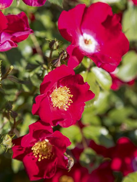 Paysager. Bouquets de 2-10 fleurs de 6 cm de diamètre, d'une quinzaine de pétales, rouge foncé, sans discontinuer de juin jusqu'aux gelées. Feuillage dense, vert foncé, les jeunes feuilles légèrement teintées de bronze. Excellente résistance aux maladies.