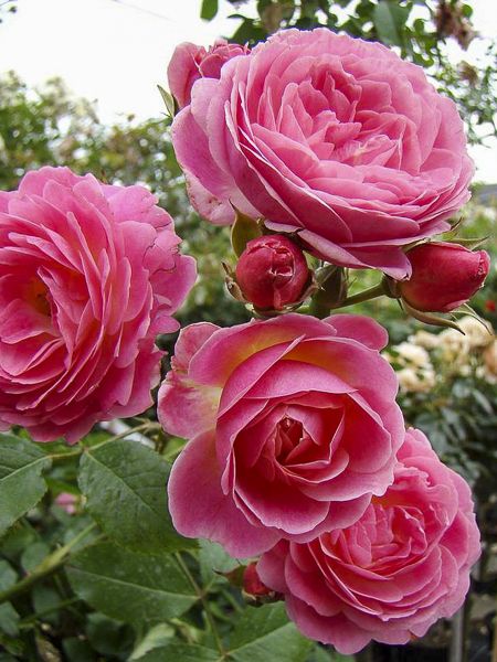 Bouquets de fleurs de 5 cm, bien doubles, rose à rose sombre, marqué de jaune à la base des pétales. Léger parfum. Très bonne remontée.