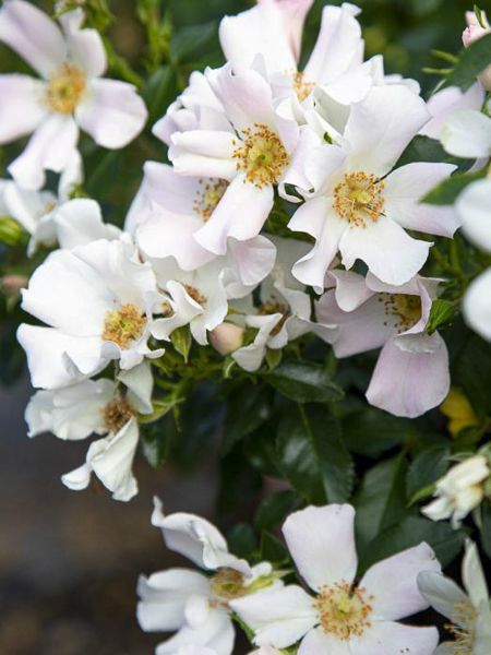 Paysager compact. Bouquets de 3-10 églantines, de 6 cm de diamètre, blanches teinté de rose, suivies de fruits rouge vermillon. Feuillage dense, vert foncé, les jeunes feuilles légèrement teintées de bronze. Excellente résistance aux maladies.