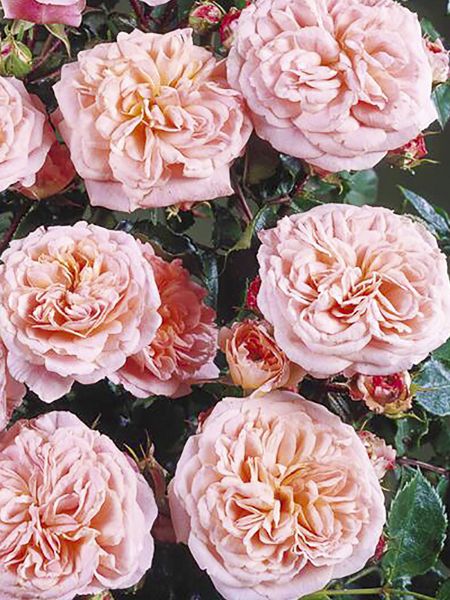 Fleurs turbinées rose saumon cuivré. Très parfumé. Résistant aux intempéries et aux maladies.